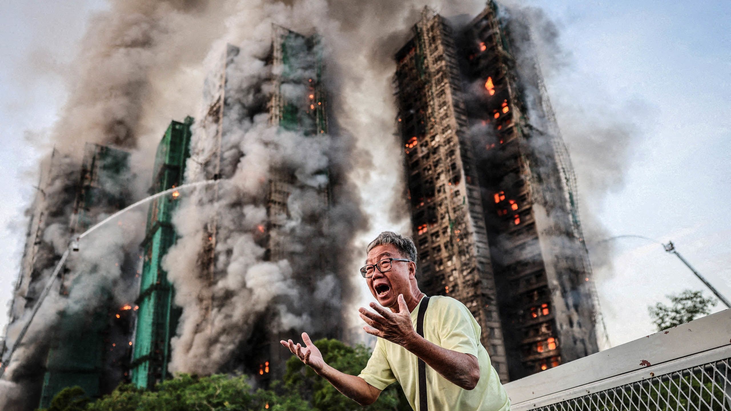 Wong, 71, shouts on Nov. 26, grief-struck that his wife was trapped inside Wang Fuk Court during a major fire. The buildings are in the Tai Po district of the New Territories in Hong Kong. (Photo by Tyrone Siu/Reuters)