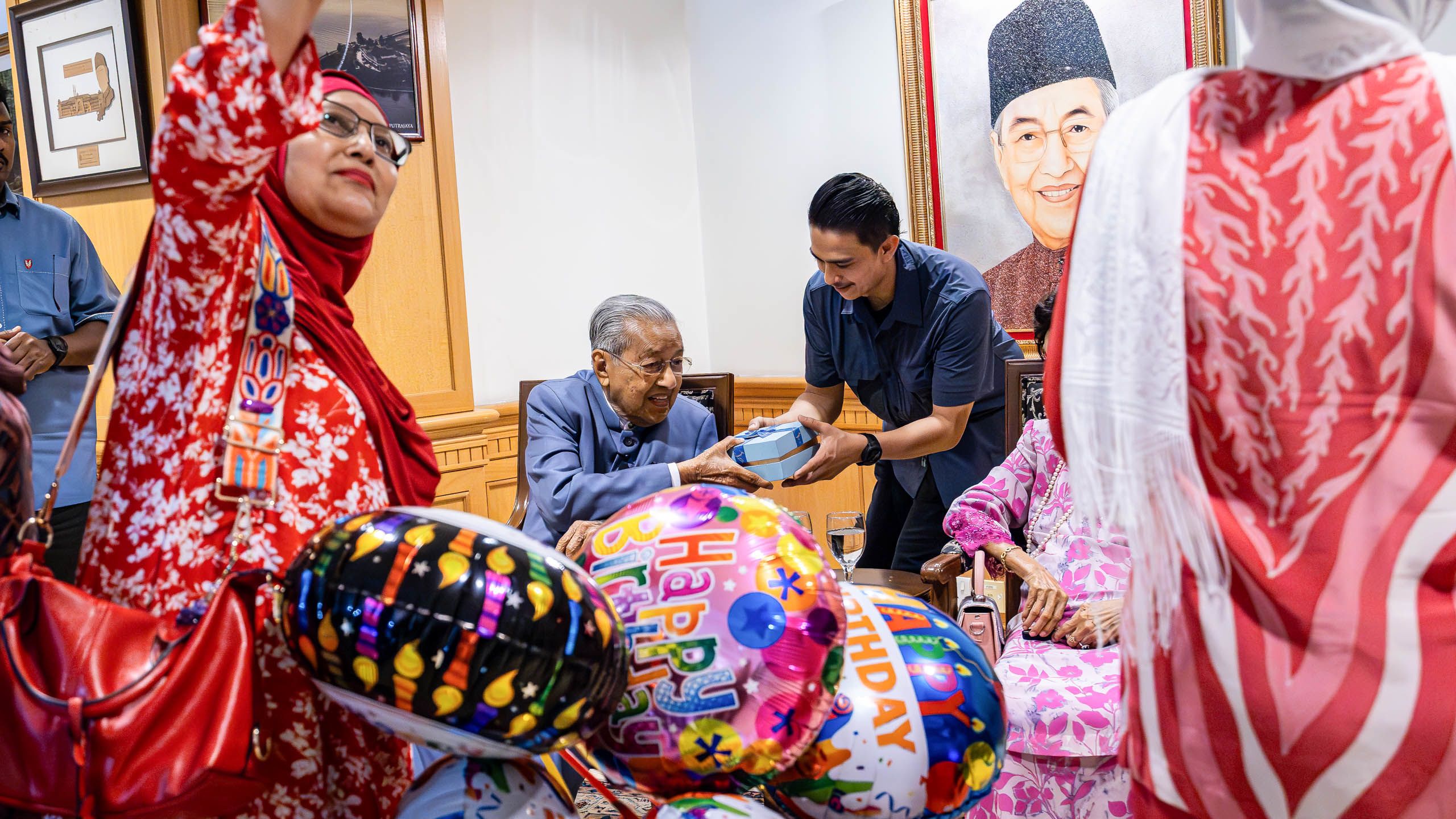 Mahathir Mohamad receives gifts from supporters during a birthday meet‑and‑greet on July 10 in Putrajaya. Mahathir Mohamad, one of the world's oldest living former heads of government, turned 100 that day. Born in 1925, he entered politics in the 1940s and twice served as Malaysia's prime minister, for a 22-year term starting in 1981 and then for about two years beginning in 2018. (Photo by Annice Lyn/Getty Images)
