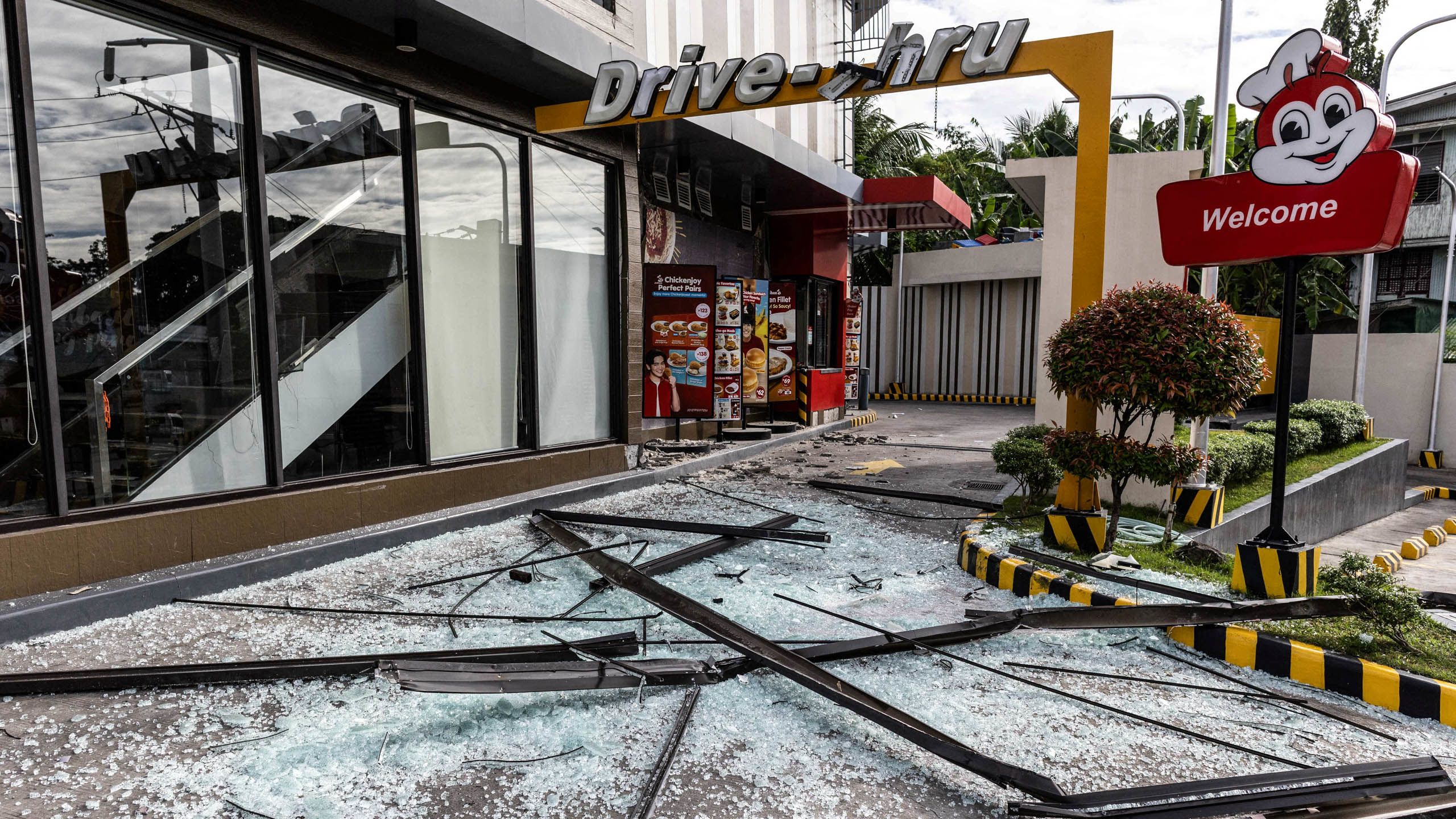 Debris remains scattered outside a damaged Jollibee restaurant in the aftermath of a magnitude 6.9 quake that shook Bogo, Cebu province, the Philippines, on Oct. 1, 2025. (Photo by Eloisa Lopez/Reuters)