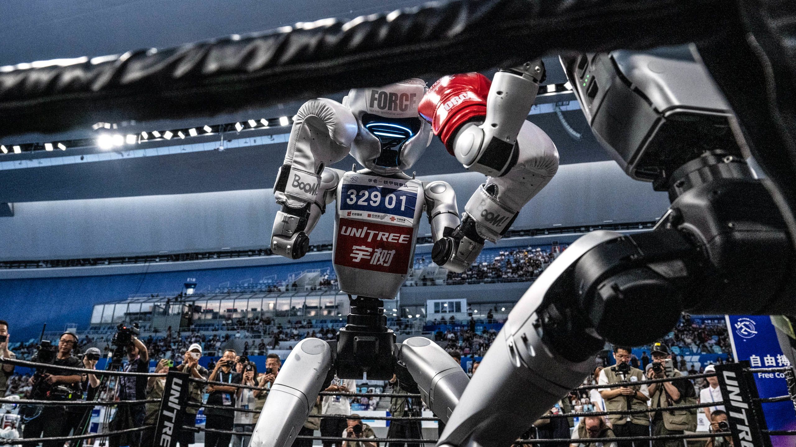 Humanoid robots fight during the kickboxing finals on Aug. 17. The World Humanoid Robot Games took place from Aug. 15-17 at the National Speed Skating Oval, a venue for the 2022 Beijing Winter Olympics, and included an opening ceremony a day earlier that featured robots that could dance and play musical instruments. More than 500 androids showcased their capabilities during the world's first Olympic-style competition of its kind. (Photo by Kevin Frayer/Getty Images)