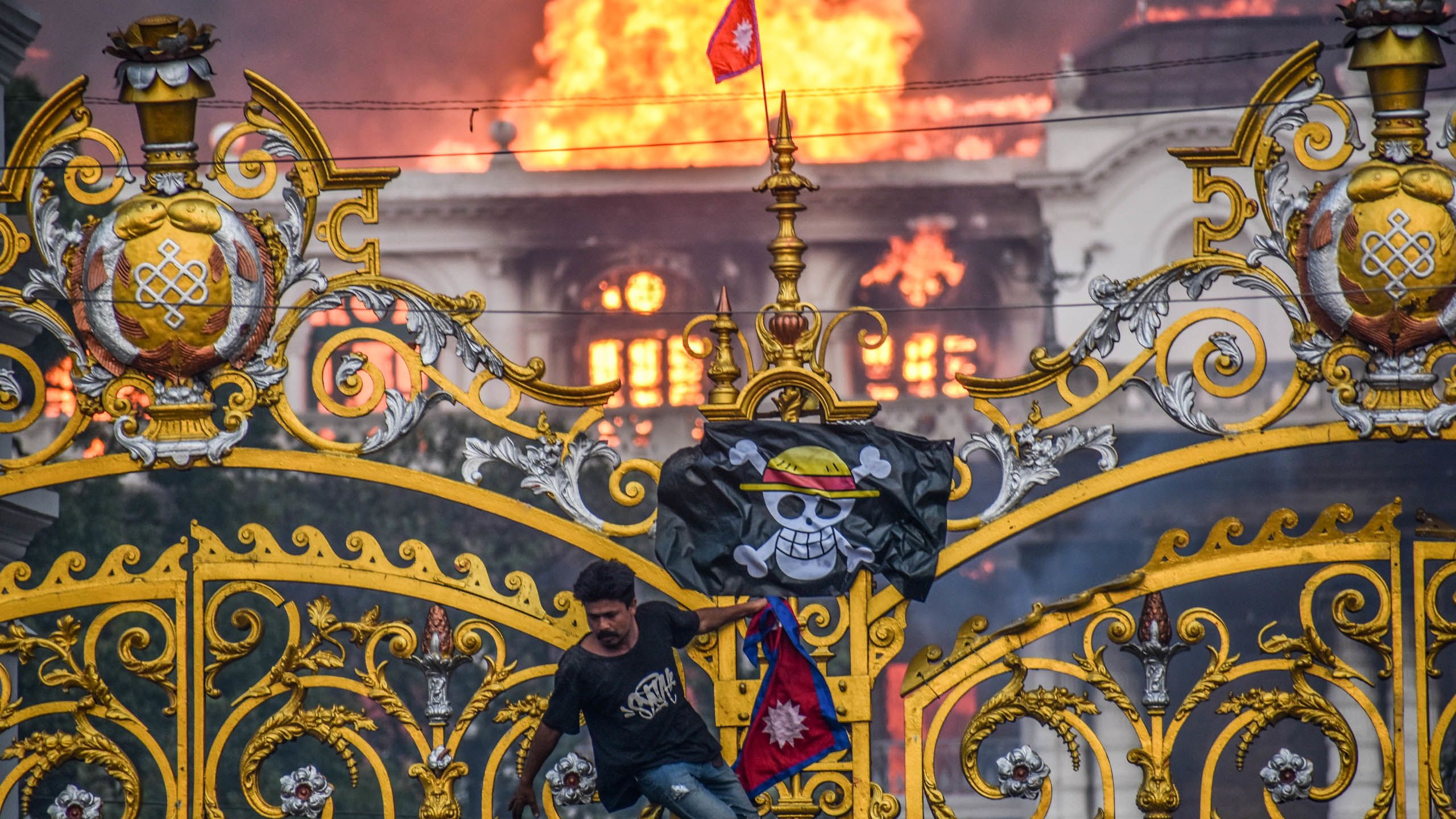 A protester hangs a One Piece pirate flag as smoke and flames rise from the Singha Durbar after people set fire to the palace in Kathmandu, Nepal, on Sept. 9. The protests erupted over a government decision to block access to some social media platforms. Clashes with police on Sept. 8 left 19 dead. The ban was lifted on Sept. 9, and Prime Minister K.P. Sharma Oli resigned later that day. (Photo by Sunil Pradhan/Anadolu/Getty Images)