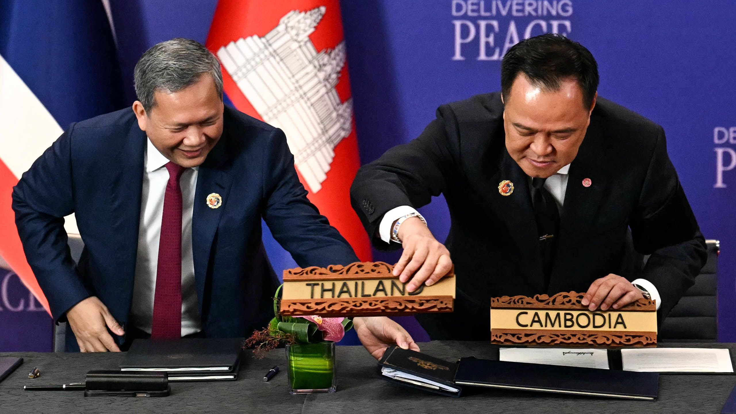 Cambodian and Thai prime ministers Hun Manet, left, and Anutin Charnvirakul change seats during the ceremonial signing of a ceasefire agreement, which came on the sidelines of the 47th ASEAN Summit, in Kuala Lumpur, Malaysia, on Oct. 26. (Photo by Mohd Rasfan/Reuters)