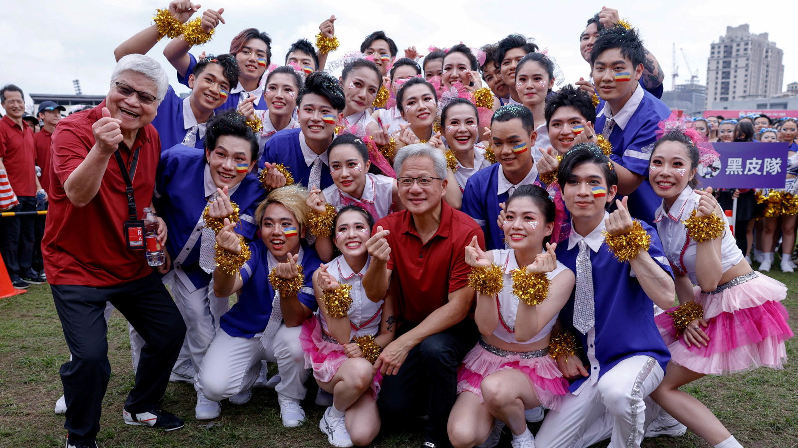 TSMC Chief Executive C.C. Wei and Nvidia CEO Jensen Huang pose for photos during TSMC’s annual sports day in Hsinchu, Taiwan, on Nov. 8. (Photo by Ann Wang/Reuters)