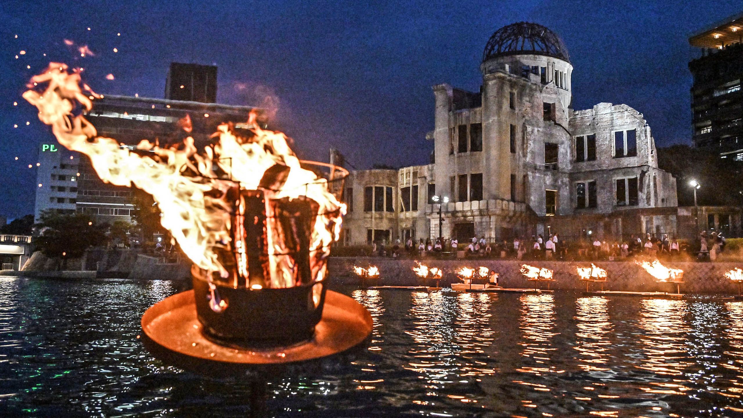 Bonfires are lit along the Motoyasu River in front of the Atomic Bomb Dome during a remembrance ceremony in Hiroshima on Aug. 5. A day later, the city marked 80 years since the U.S. atomic bombing. At a ceremony at Hiroshima Peace Memorial Park, officials called on young people to work toward the abolition of nuclear weapons, fearing a new nuclear arms race. (Photo by Yo Inoue)