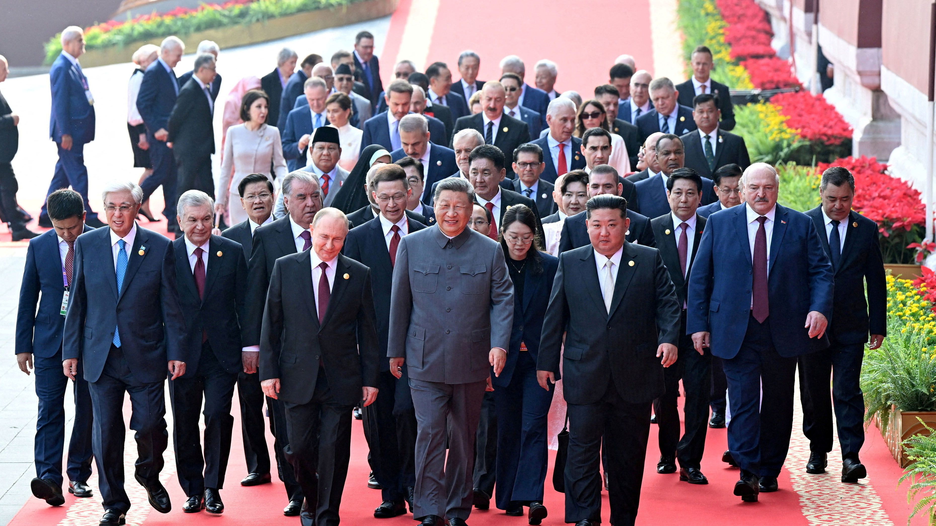 North Korean leader Kim Jong Un and Russian President Vladimir Putin walk with Chinese President Xi Jinping as they attend a military parade marking the 80th anniversary of the end of World War II, in Beijing on Sept. 3, 2025, in this picture released by the Korean Central News Agency. (Photo by KCNA/Reuters)