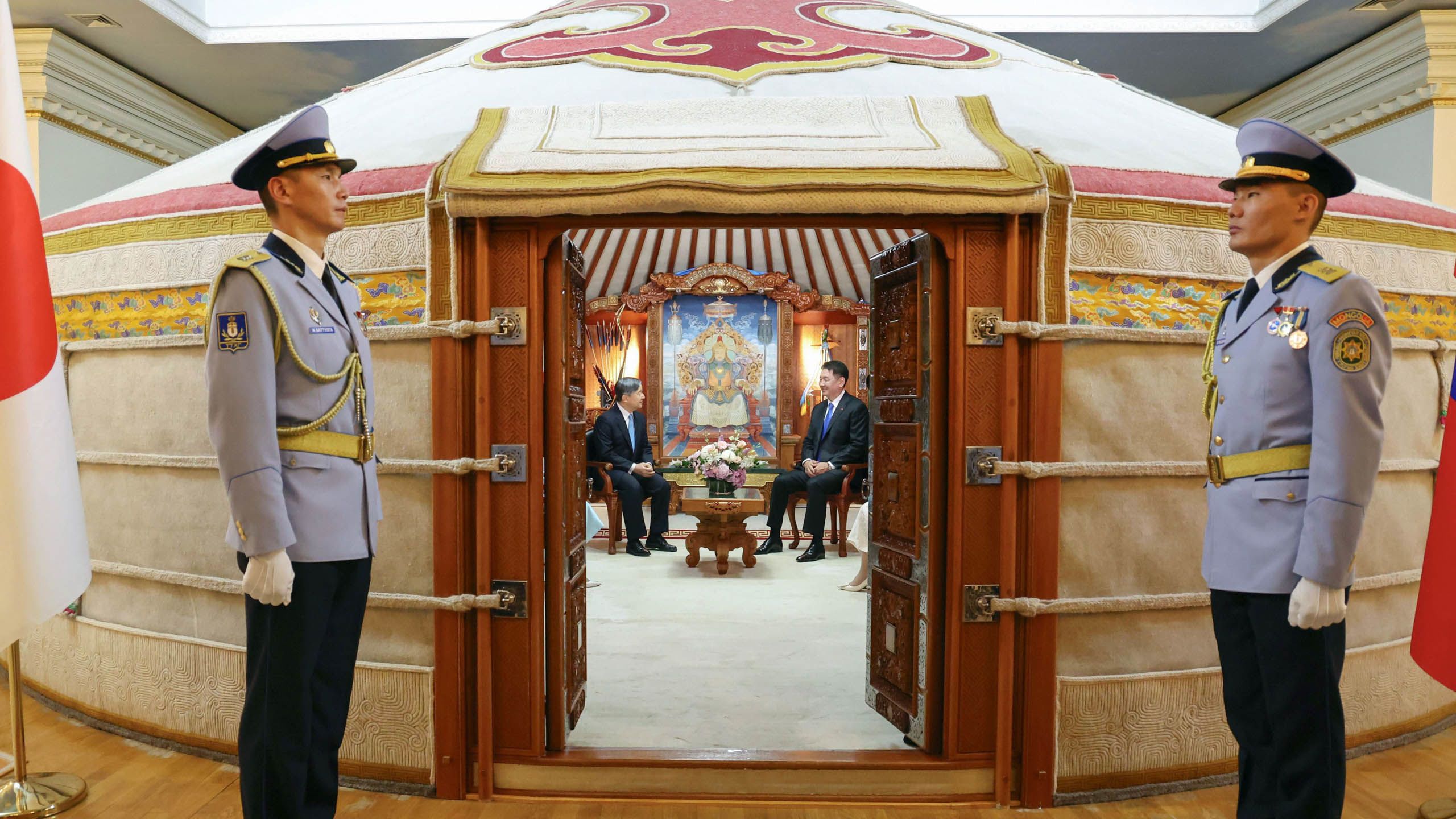Emperor Naruhito talks with Mongolian President Ukhnaagiin Khurelsukh in a traditional ger tent at the government office in Ulaanbaatar on July 8. Japanese Emperor Naruhito and Empress Masako visited Mongolia from July 6 to July 13, casting a spotlight on the widely forgotten detention of thousands of Japanese soldiers and civilians in the last days of World War II. The emperor said he wished "to pay tribute to and ponder over the hardship of those who unwillingly lost their lives far away from their homeland." (Pool photo)