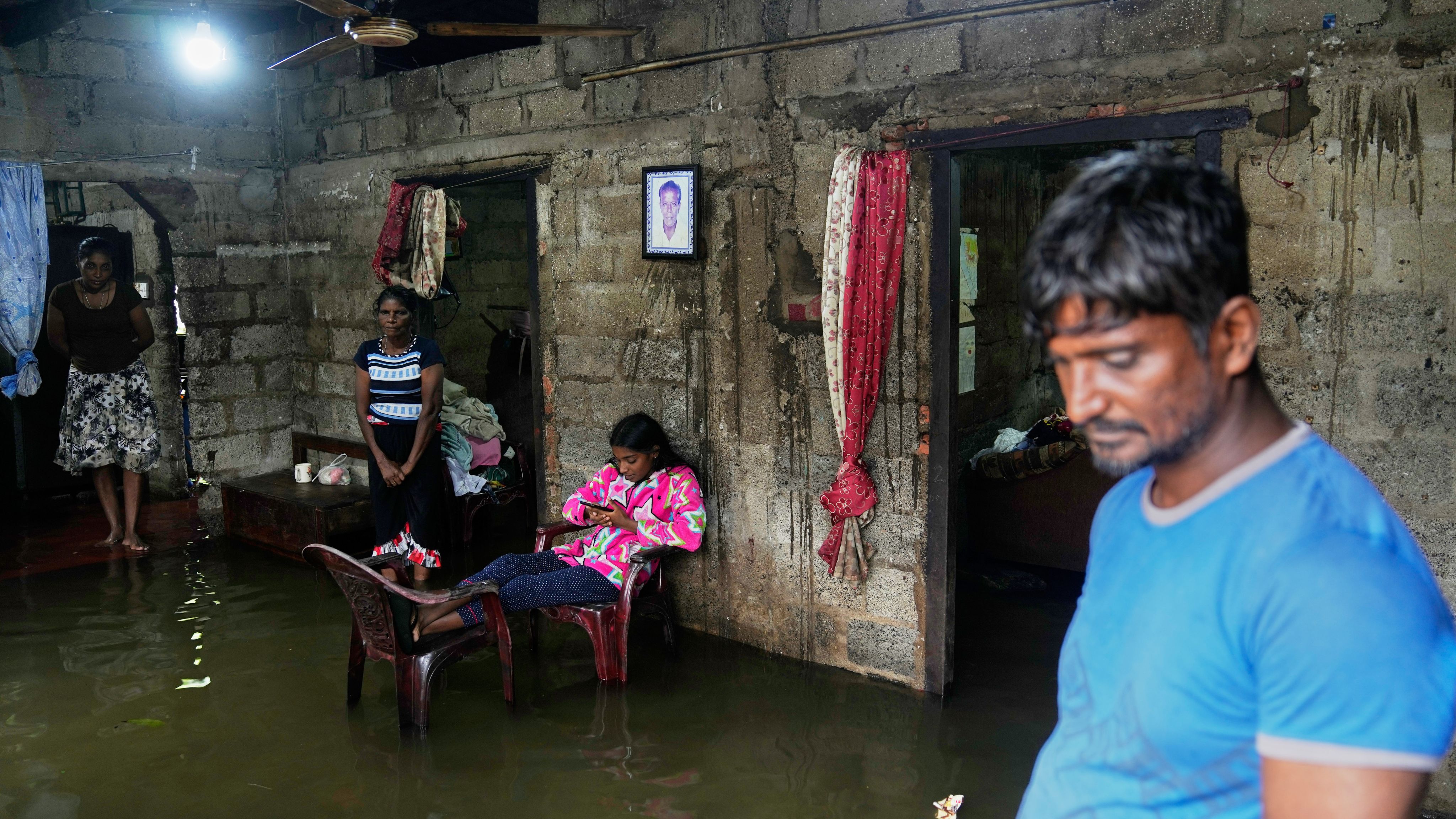 A family looks forlorn in a room inundated by rainwater in Colombo on Nov. 28. (Photo by Eranga Jayawardena/AP)