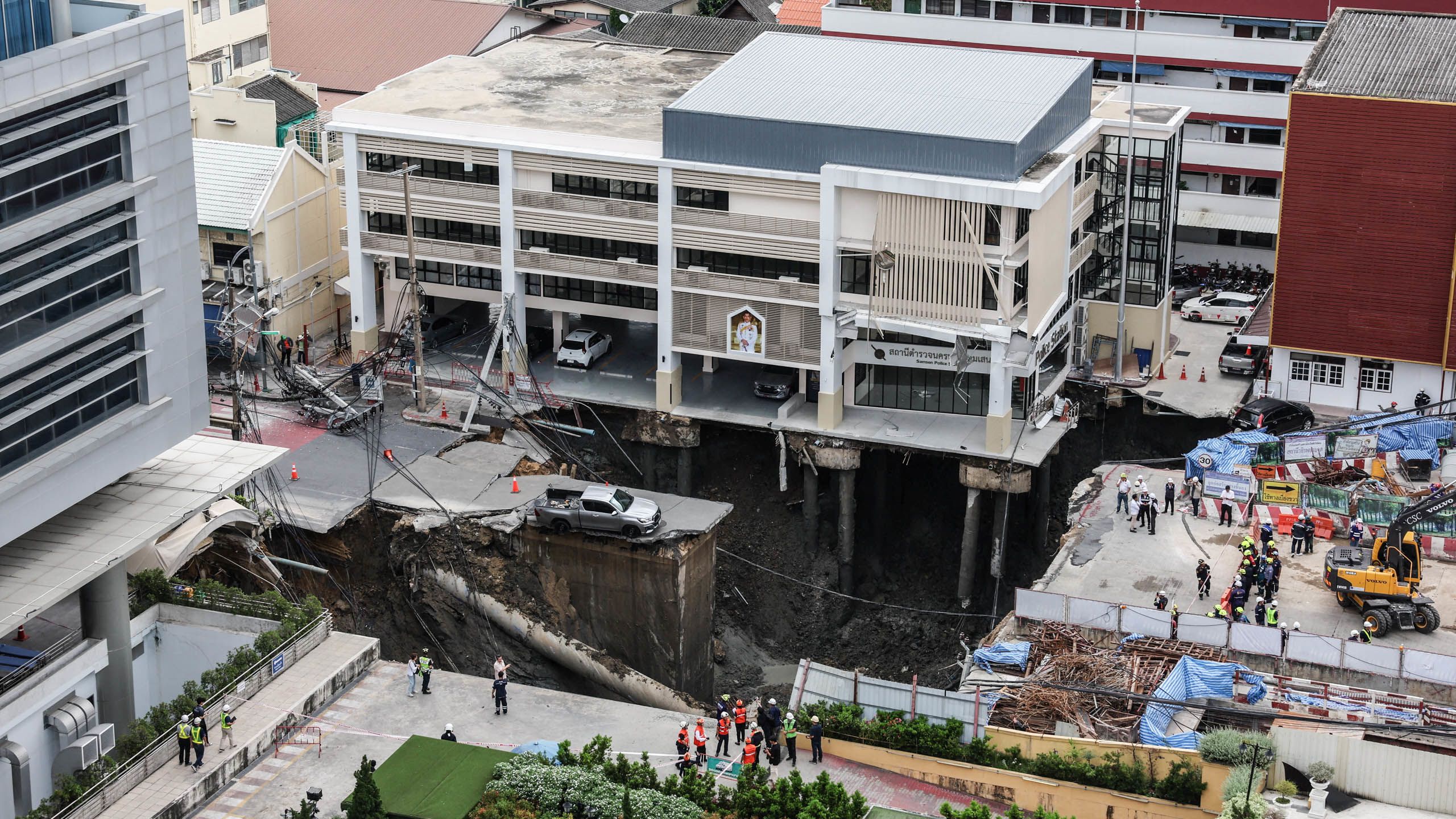A massive sinkhole opens on Samsen Road near Vajira Hospital, in Bangkok, on Sept. 24. The roughly 50-meter-deep sinkhole formed just outside a police station and Vajira Hospital, pulling down power lines and bursting a water main. (Photo by Chalinee Thirasupa/Reuters)
