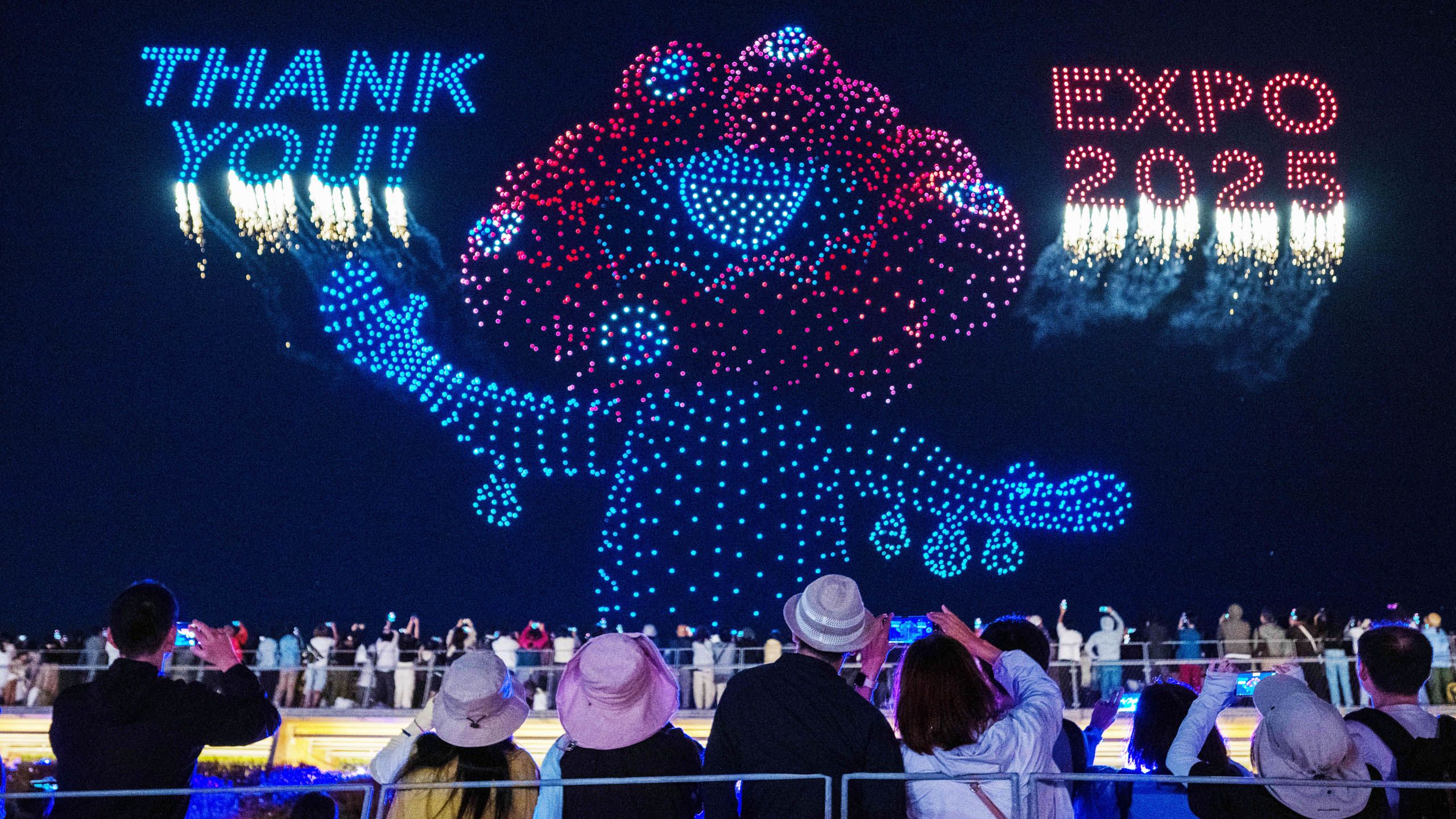 Drones create an image of mascot Myaku Myaku as part of World Expo 2025 Osaka’s closing ceremony on Oct. 13, after a 184-day run. Despite a rocky start, 25 million visitors ended up attending the fair. (Photo by Yo Inoue)