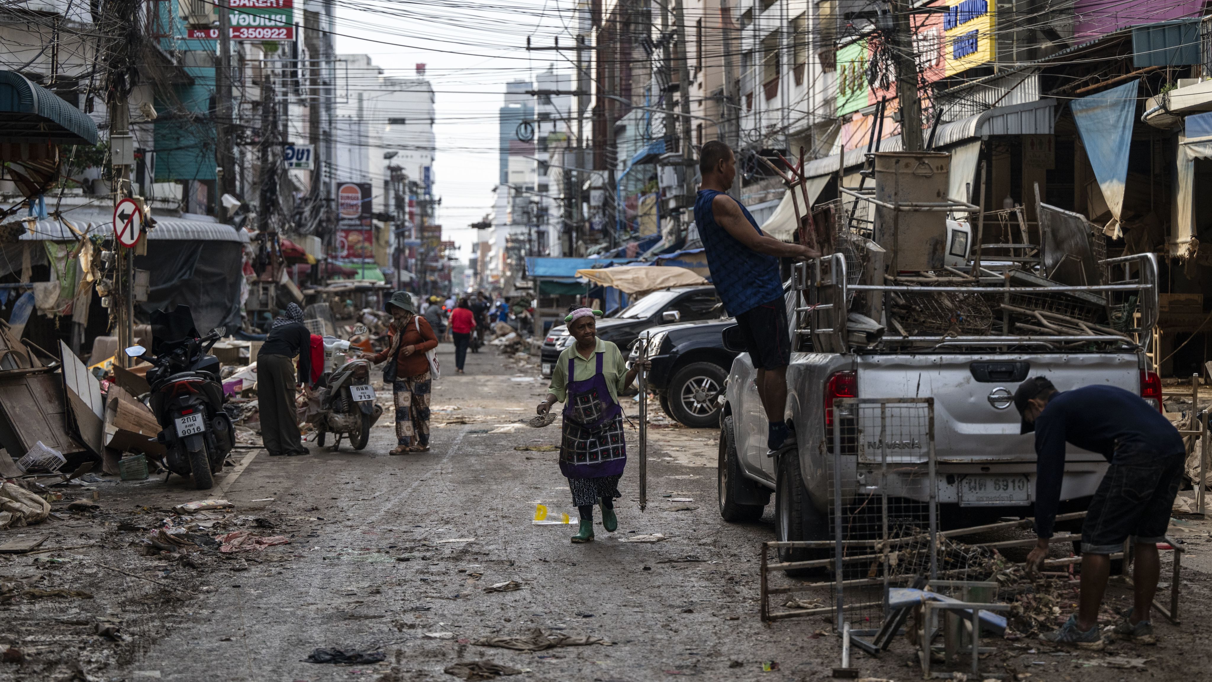 Residents clean up a commercial district of downtown Hat Yai as floodwaters receded on Nov. 29. (Photo by Sirachai Arunrugstichai/Getty Images)