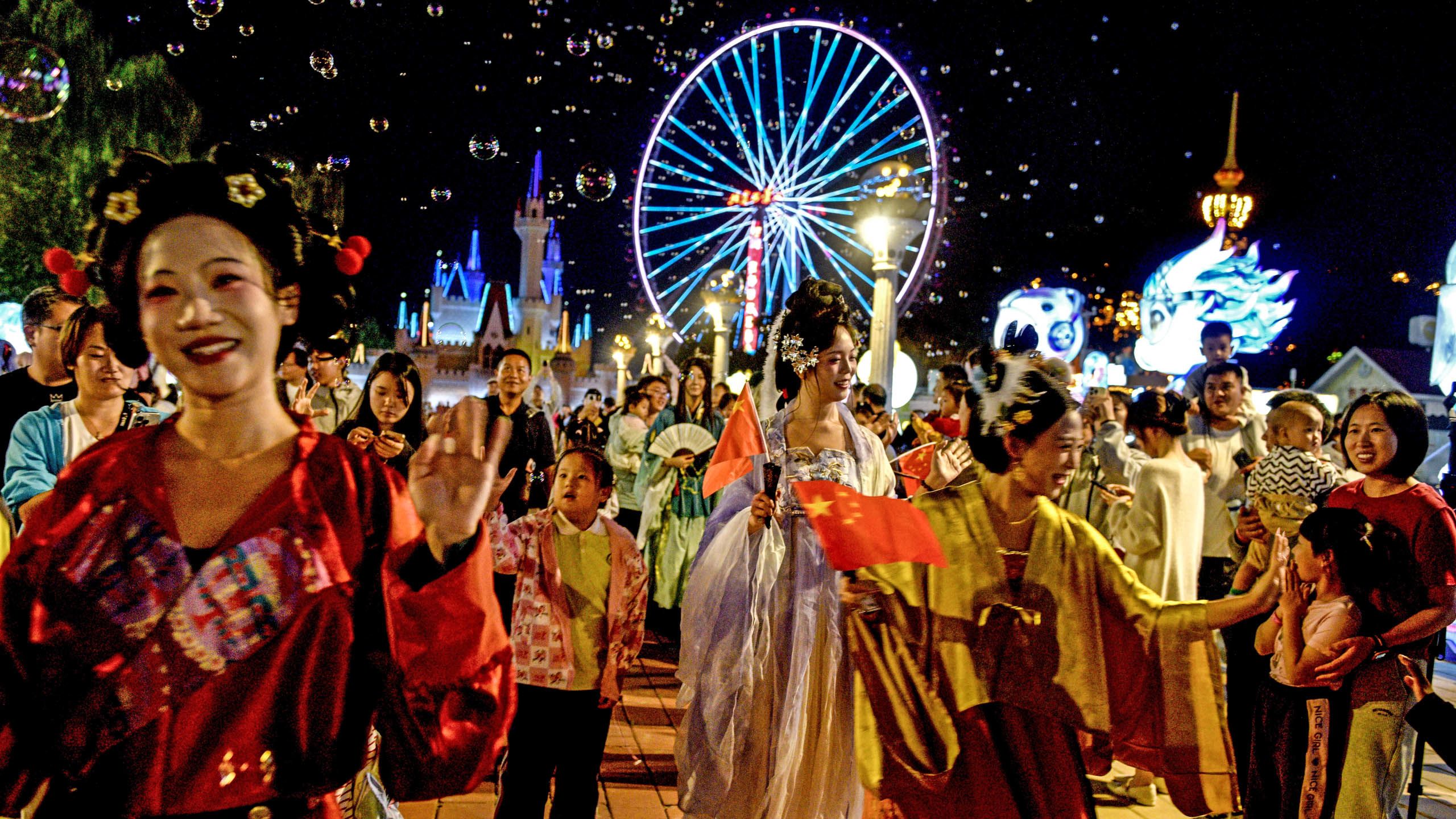 Tourists watch a parade at the Shijingshan Amusement Park in Beijing on Oct. 3. The eight-day Mid-Autumn Festival began on Oct. 1, sparking a surge in travel. (Photo by Li Wenming/AP)