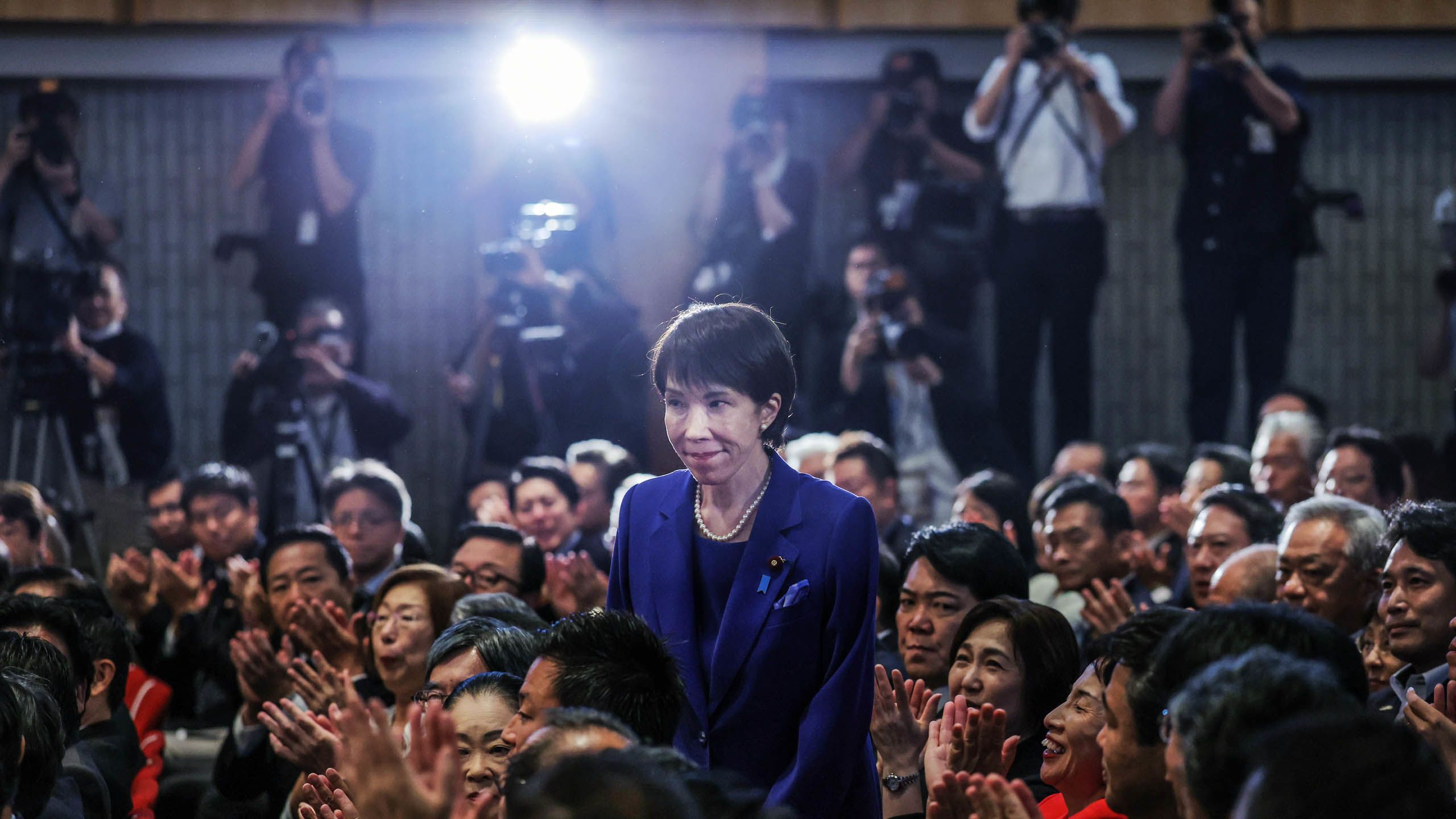 Sanae Takaichi on Oct. 4 basks in the applause of Liberal Democratic Party members who had just elected her to lead their party. (Photo by Shun Kato)