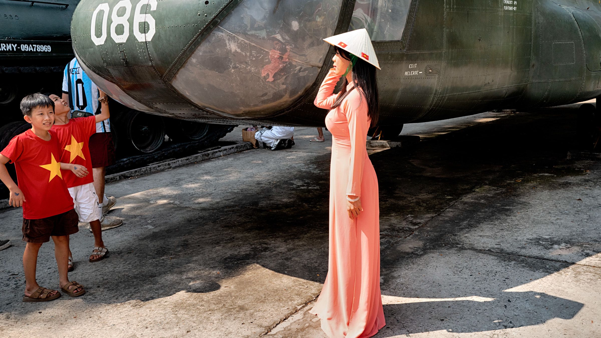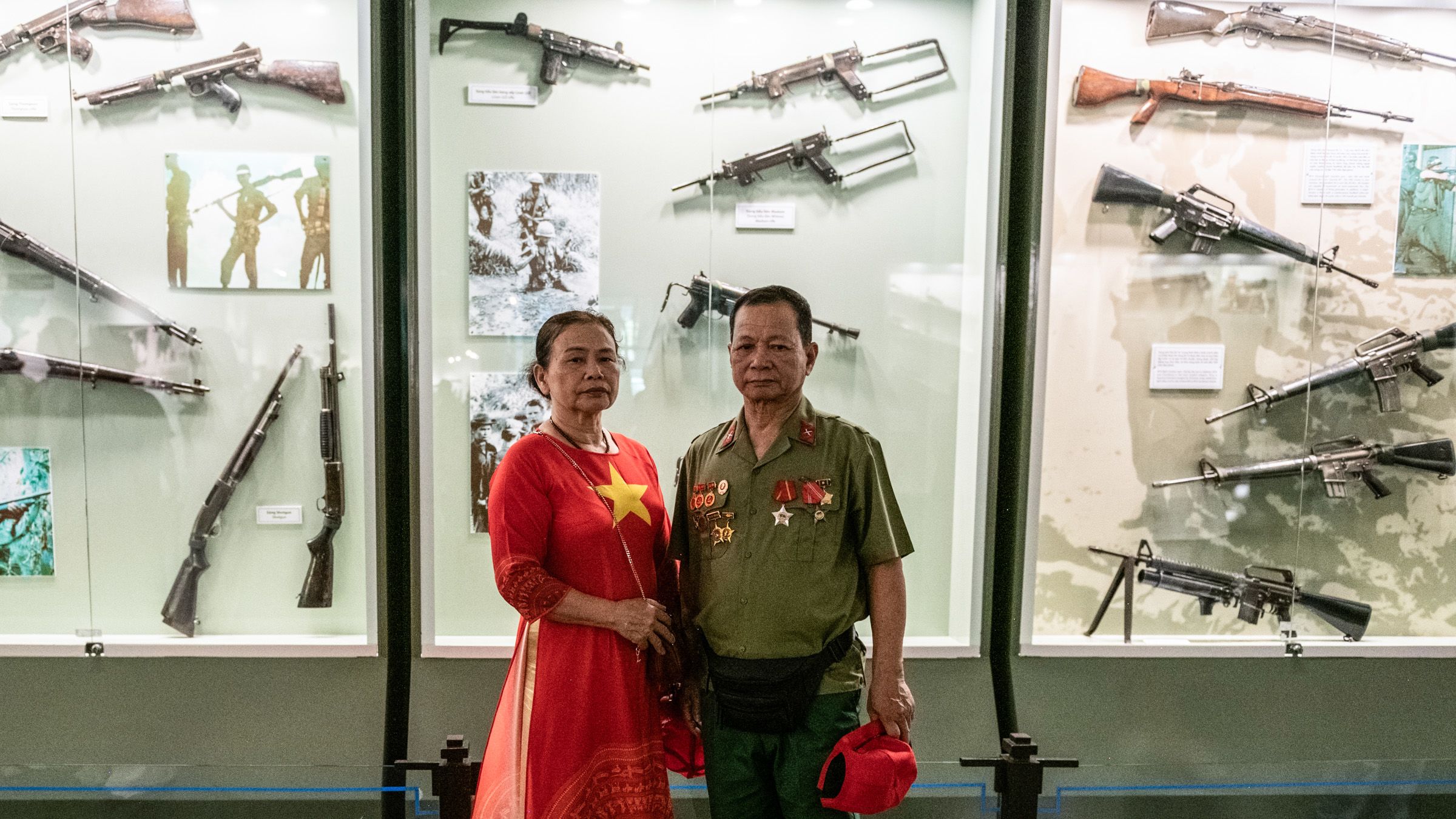 A couple poses for a photo as they tour the War Remnants Museum in Ho Chi Minh City on April 28. (Photo by Thanh Hue/Getty Images)