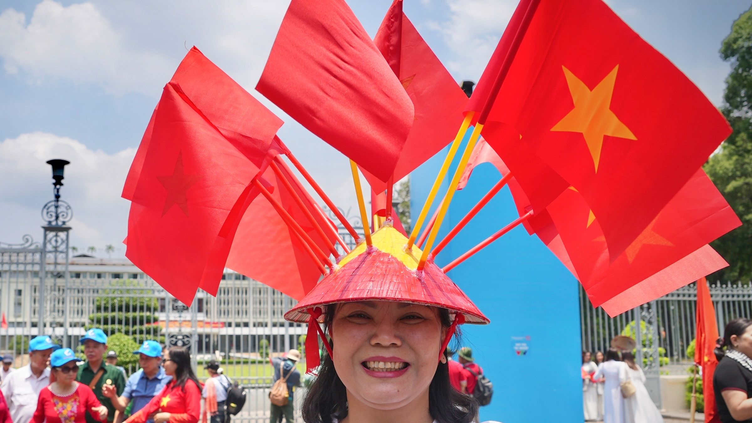 A woman wears a conical hat decorated with Vietnamese flags in front of the Independence Palace in Ho Chi Minh City on April 29. (Photo by Hau Dinh/AP)