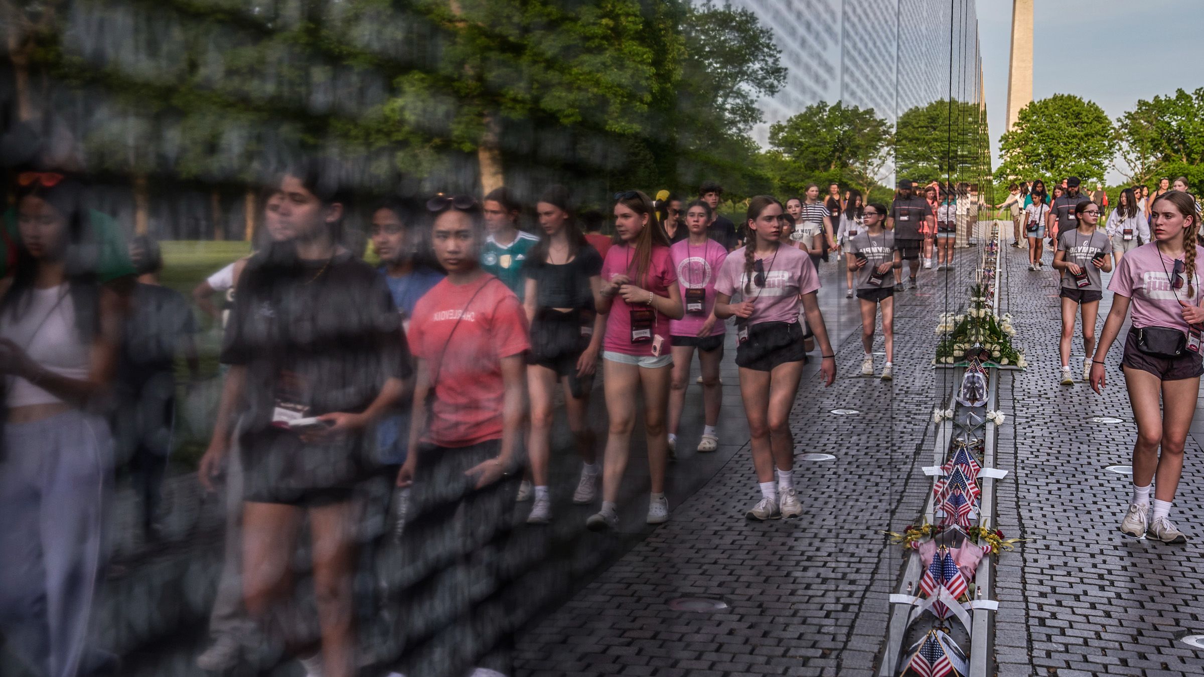 Students images are reflected in the Vietnam Veterans Memorial wall in Washington on April 30, the 50th anniversary of the fall of Saigon. (Photo by Jacquelyn Martin/AP)
