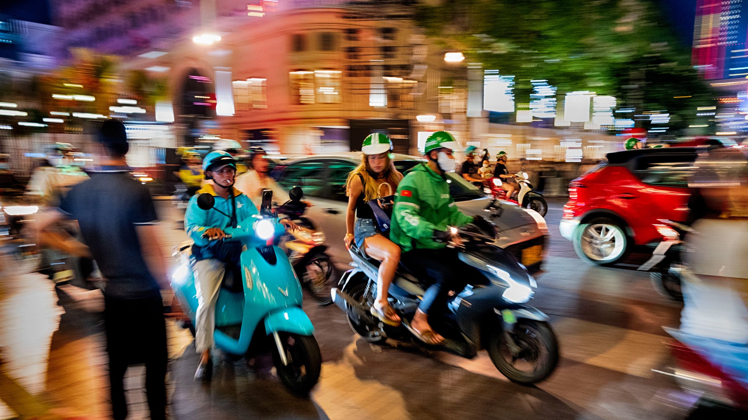 Motorists ride around central Ho Chi Minh City on April 28 during a week of celebration to mark the 50th anniversary of the end of the Vietnam War. (Photo by Richard Vogel/AP)