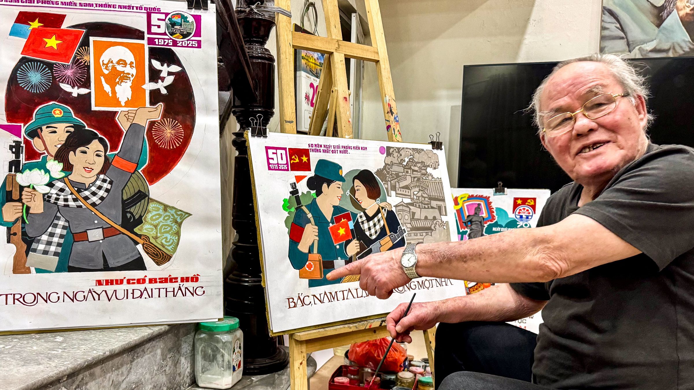 Artist Tran Duy Truc, 82, gestures to posters he created to mark the 50th anniversary of the end of the Vietnam War in Hanoi on April 29. (Photo by Phuong Nguyen/Reuters)