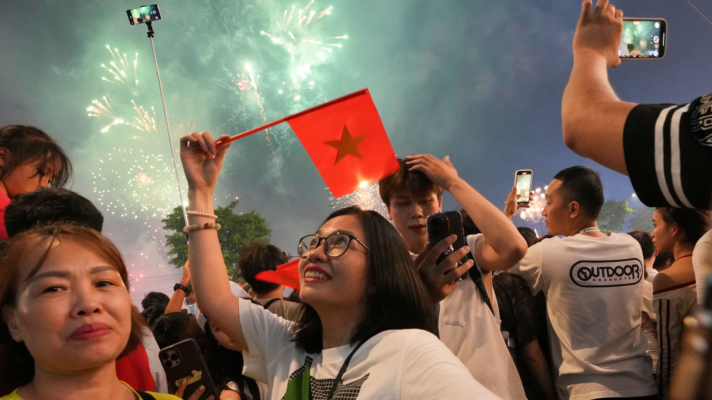People watch a fireworks display in Ho Chi Minh City on April 30. (AP Photo/Achmad Ibrahim)