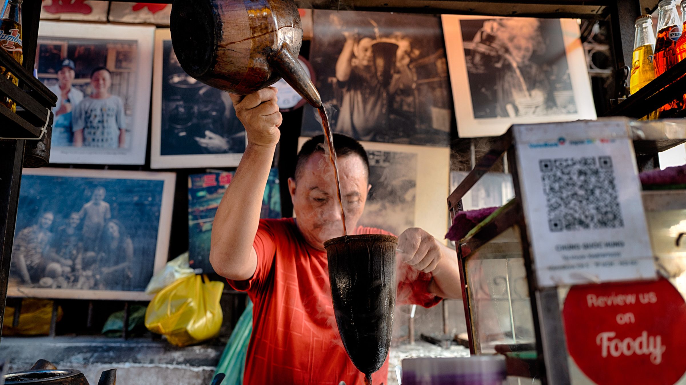 A Vietnamese barista pours a cup of coffee at a street market in the Cholon district of Ho Chi Minh City on April 29. (Photo by Richard Vogel/AP)