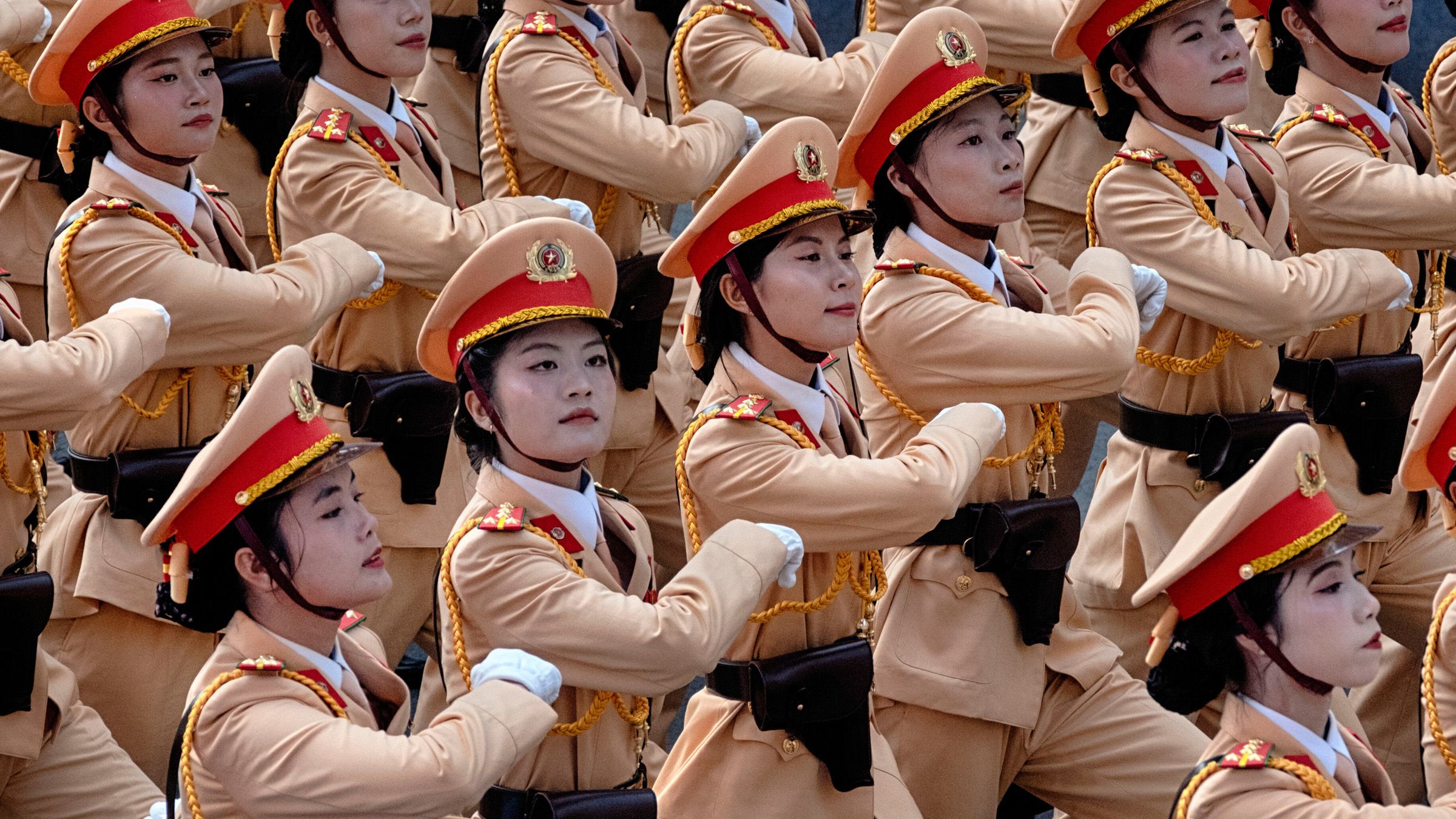 Vietnamese female police officers march during a parade in Ho Chi Minh City on April 30. (Photo byRichard Vogel/AP)