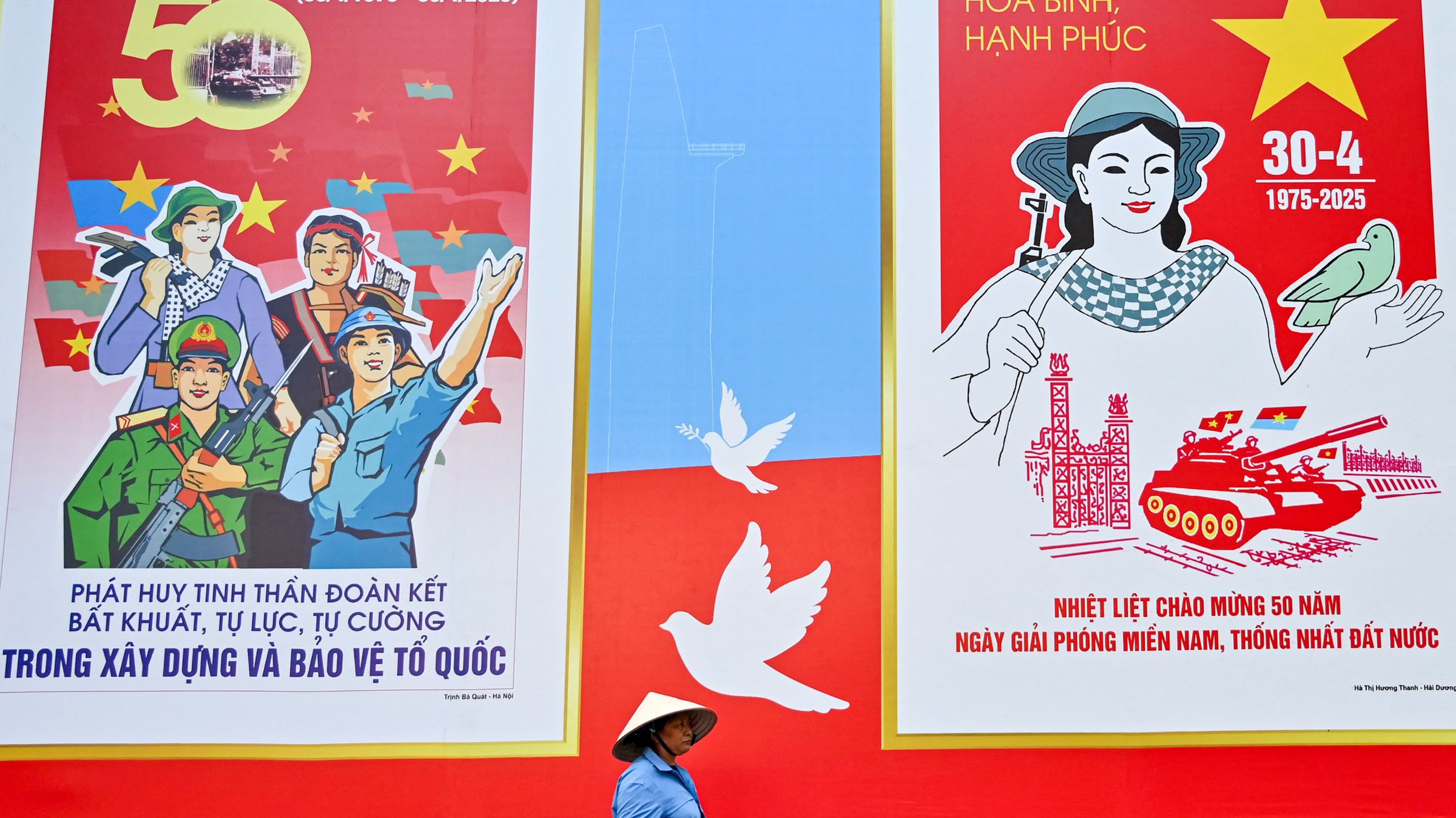 A woman walks past posters commemorating the 50th anniversary of the Vietnam War in Ho Chi Minh City on April 28. (Photo by Nhac Nguyen/AFP/Jiji)