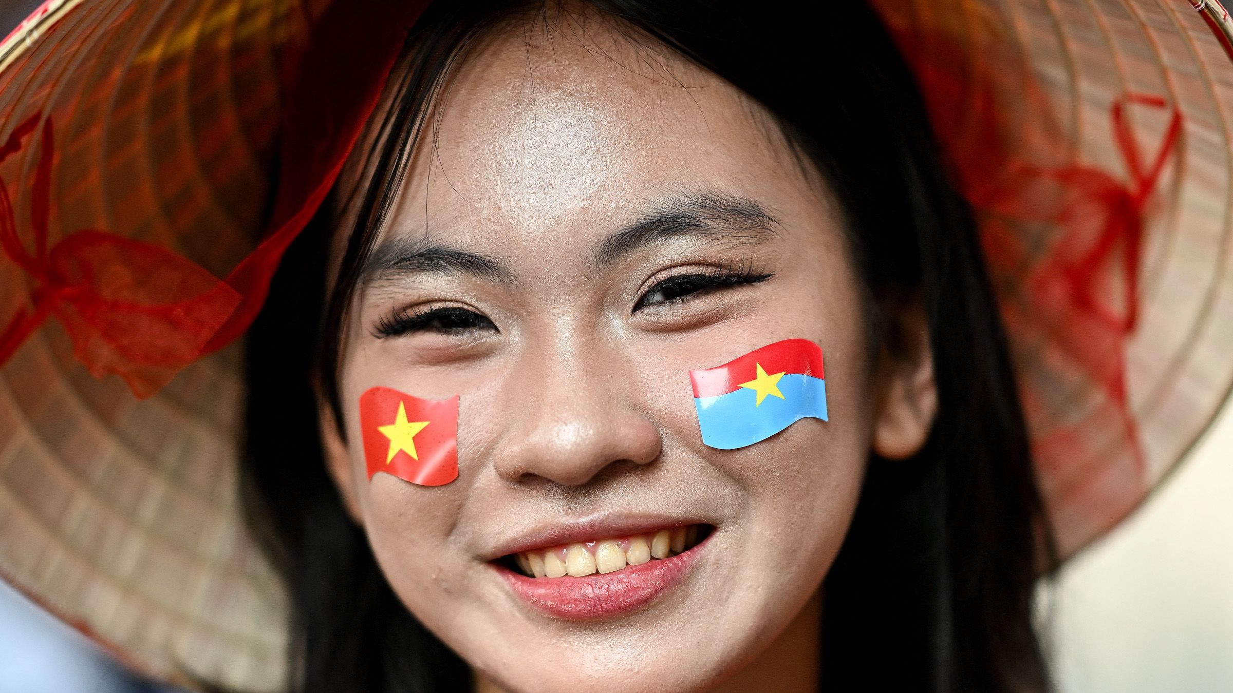 A woman poses for photos with stickers on her face depicting the flags of Vietnam and the National Liberation Front in Ho Chi Minh City on April 30. (Photo by Manan Vatsyayana/AFP/Jiji)