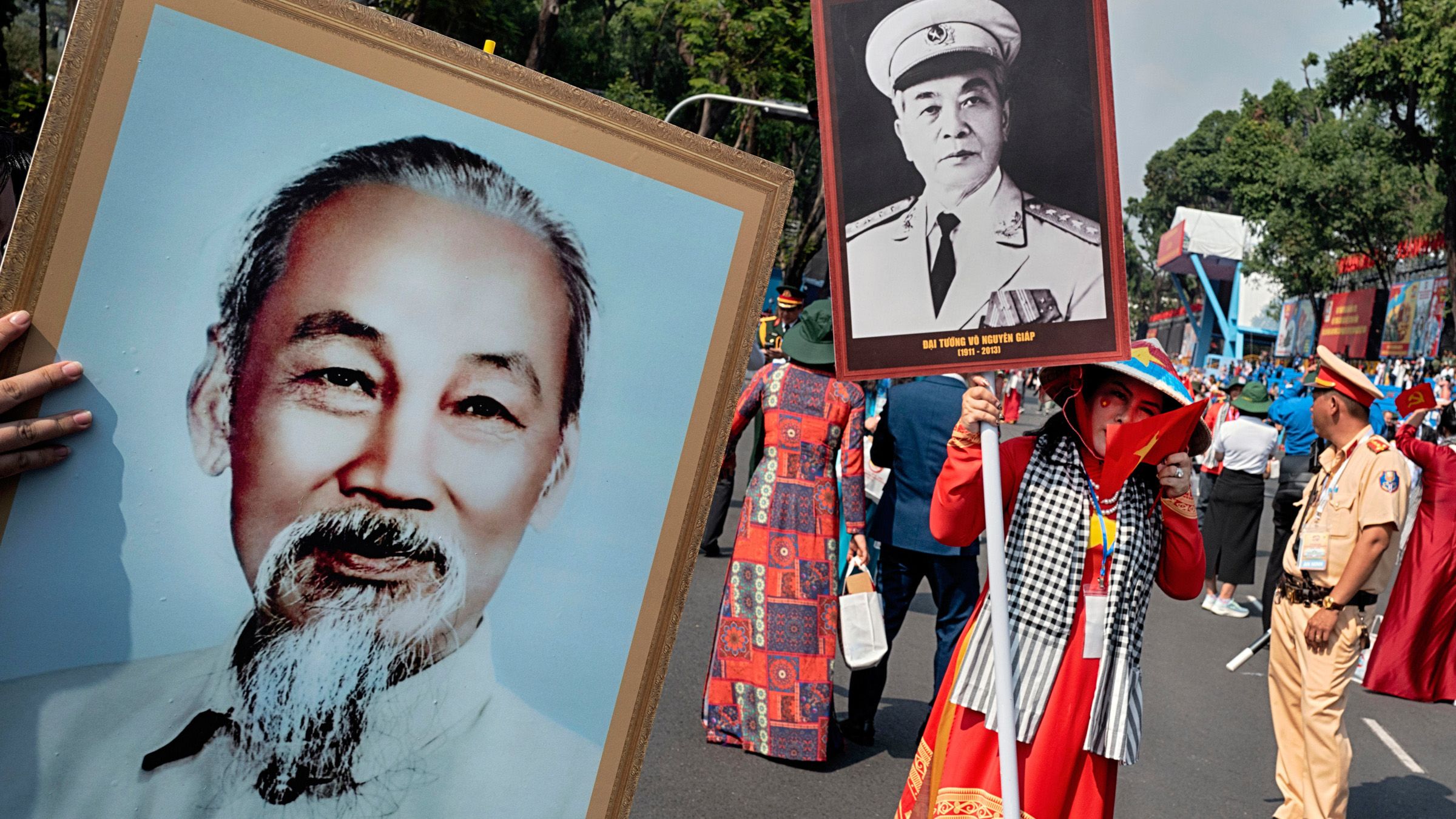 A photo of the late Vietnamese revolutionary leader Ho Chi Minh is seen following a parade in Ho Chi Minh City on April 30. (Photo by Richard Vogel/AP)