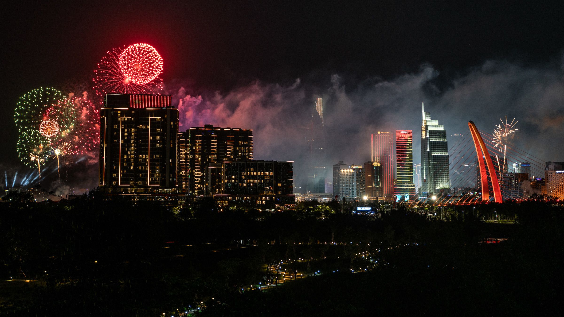 Ho Chi Minh City is illuminated by fireworks on April 30. (Photo by Magdalena Chodownik/Getty Images)