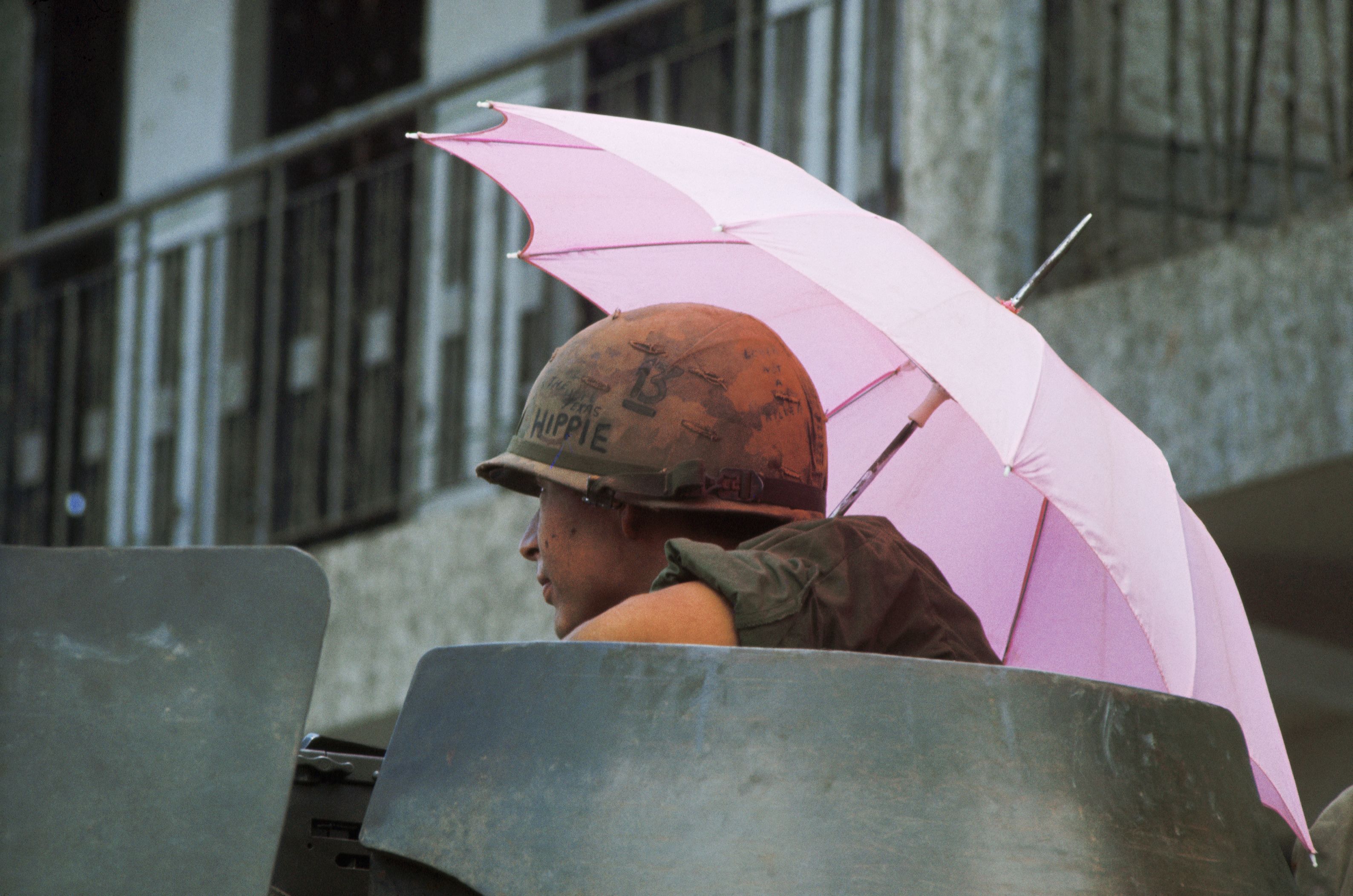 Mini-Tet, Saigon, 1968: A signature Page image of a U.S. soldier shading himself atop an armored personnel carrier. (Photo by Tim Page/Getty Images)