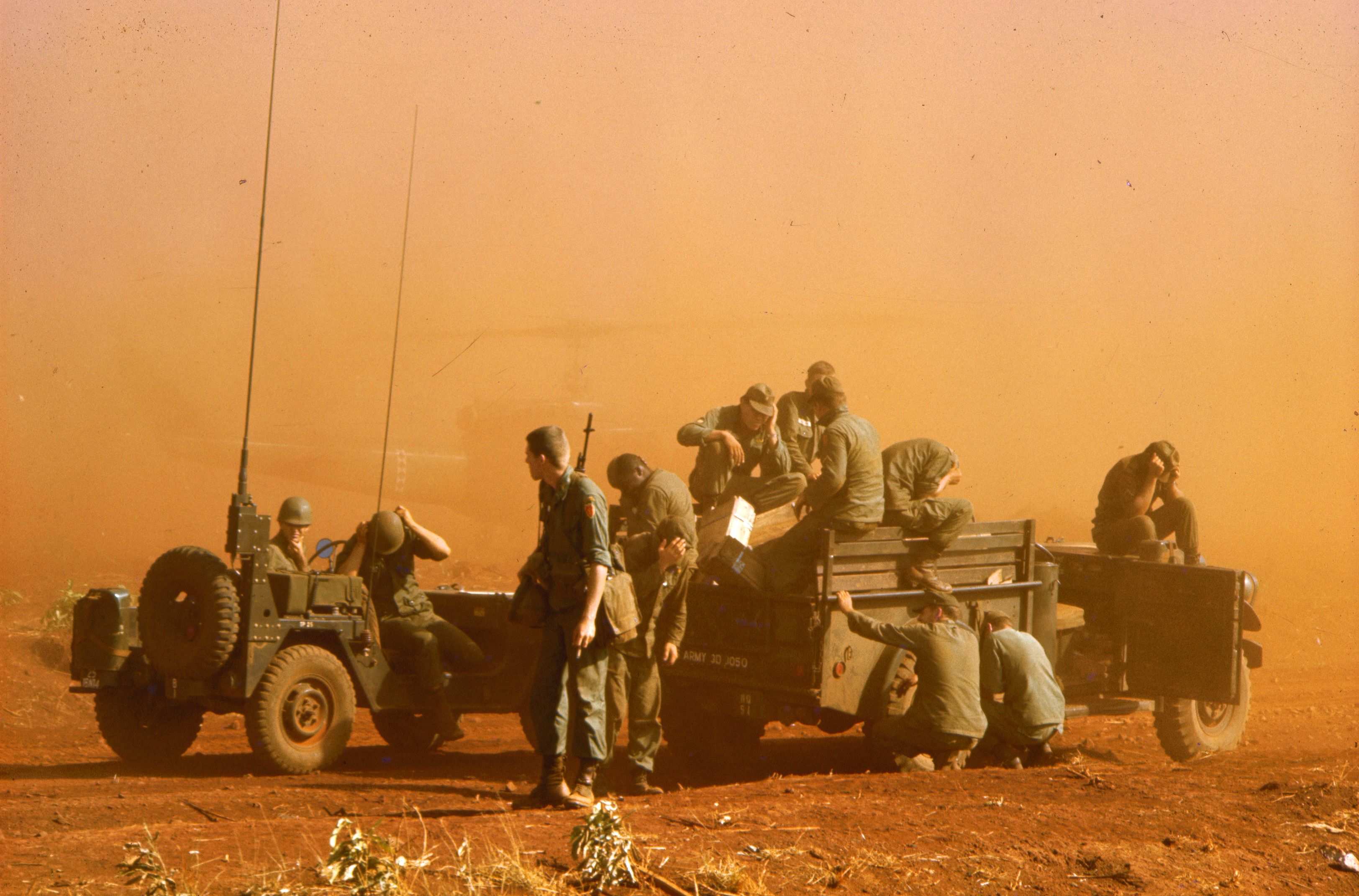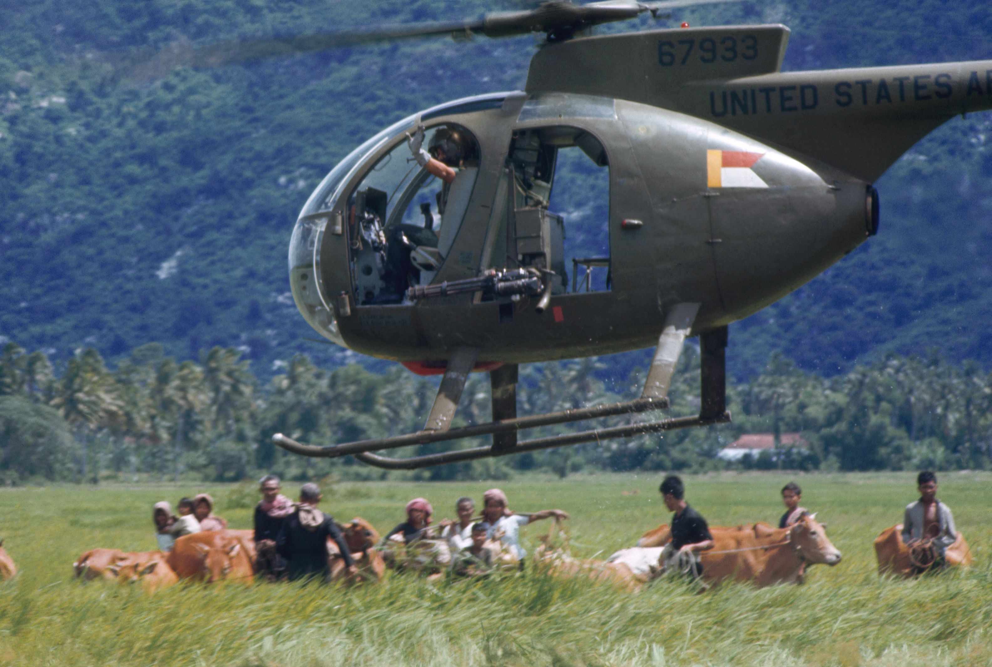 A U.S. army Loach scout helicopter corrals Vietnamese villagers in a war that became infamous for the body count of alleged communists. More than 3 million Vietnamese died, compared with 58,000 U.S. military personnel. (Photo by Tim Page/Getty Images)