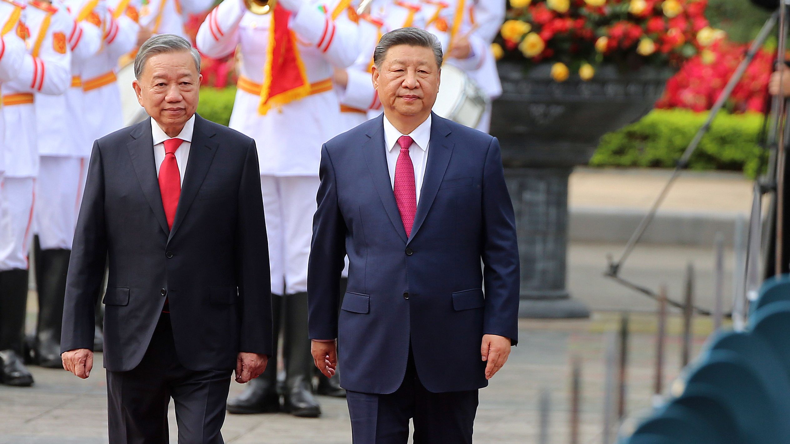 Vietnamese General Secretary of the Communist Party To Lam, left, and Chinese President Xi Jinping review a guard of honor at the Presidential Palace in Hanoi, the first stop on Xi's five-day, three-nation Southeast Asian tour in April. (Reuters)