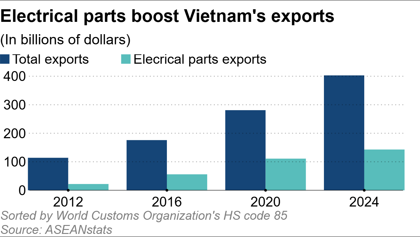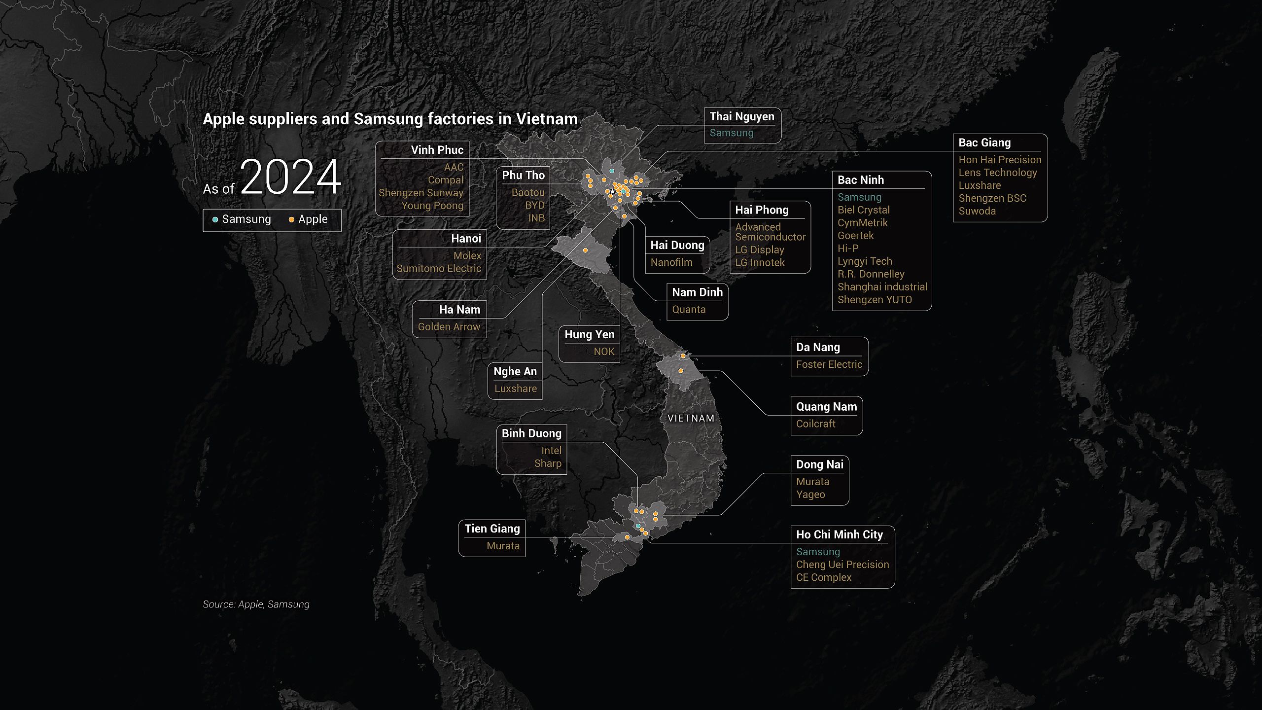 A symbol of this is Apple. According to a list the tech company began publishing in 2012, its number of suppliers in Vietnam grew from 12 in 2015 to 35 in 2024, the largest in Southeast Asia. Thailand came in second with 24 suppliers.