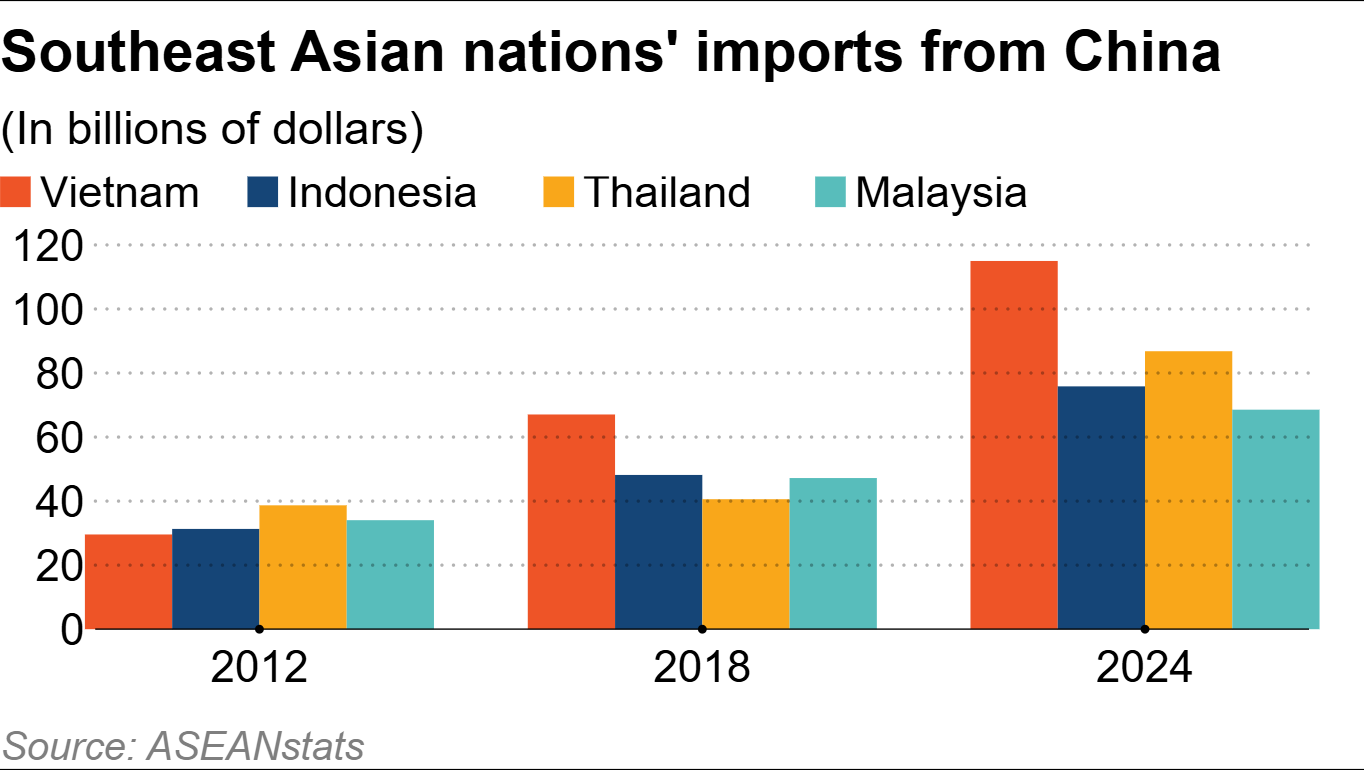 Vietnam's trade is linked to the U.S. and China. With a shift in supply chains, imports from China have increased significantly since 2010. Imports from China were almost four times higher in 2024 than in 2012. This growth rate has been much greater than that of Thailand or Malaysia.
