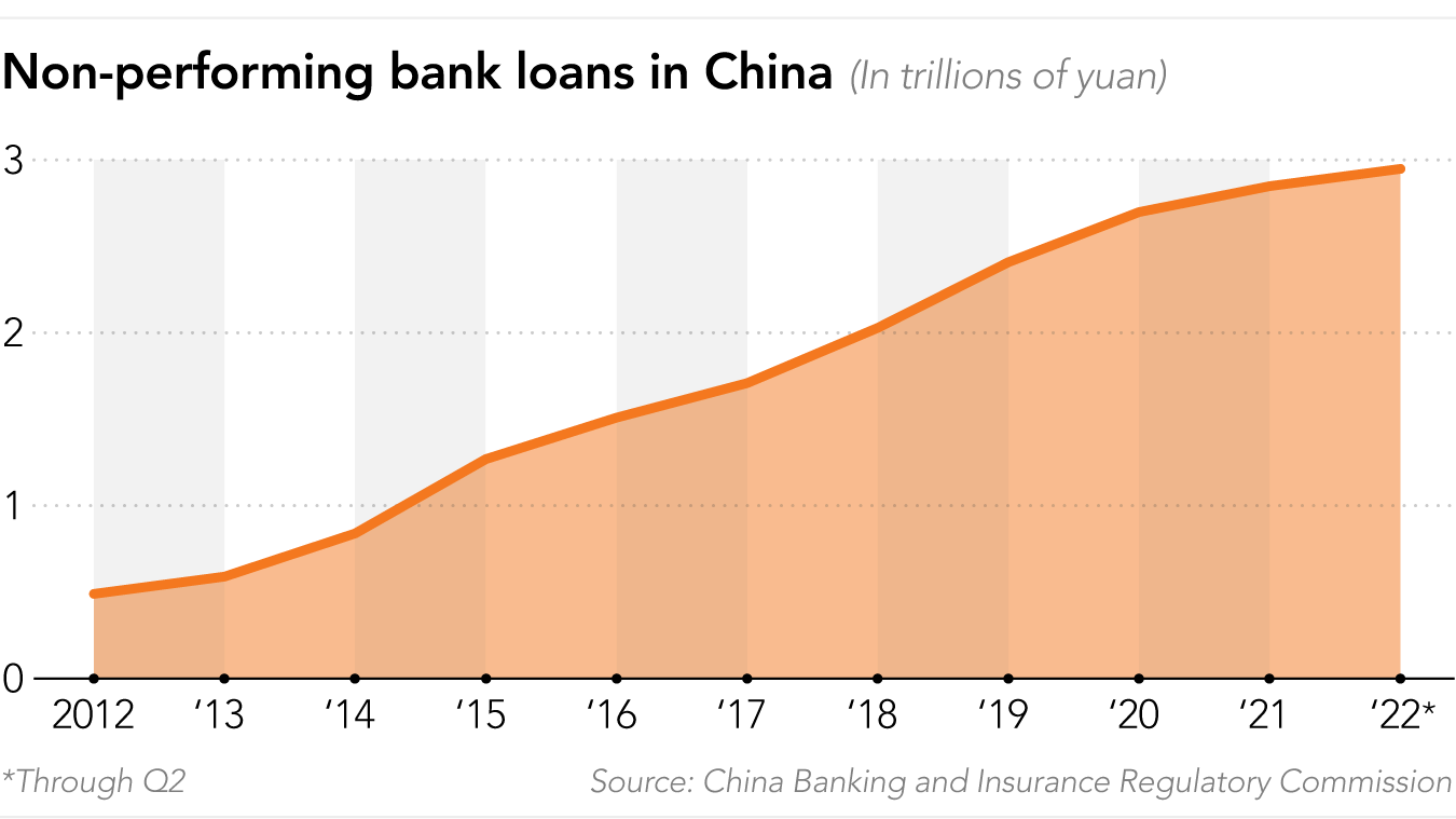 But the mission has not always been good for their balance sheets and the banking sector has become a source of political and economic concern, with bad debts piling up as growth has slowed. Nonperforming loans grew almost fivefold between the end of 2012 and mid-2022.